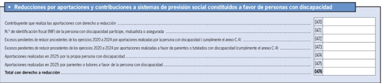 Las reducciones por aportaciones y contribuciones a planes de pensiones a favor de personas con discapacidad se incluirán en las casillas 470 a 476: