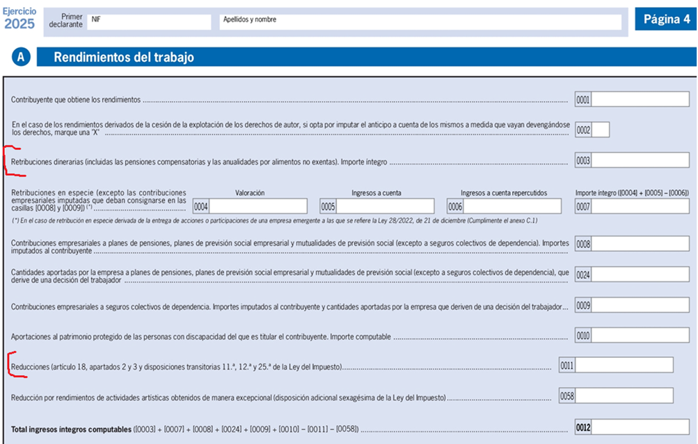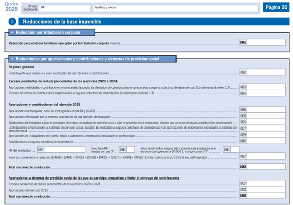 Las aportaciones y contribuciones a planes de pensiones u otros sistemas de previsión social del ejercicio 2025 se incluirán dentro del apartado “Reducciones de la base imponible”, en el subapartado “Reducción por aportaciones y contribuciones a sistemas de previsión social”, de la siguiente manera: