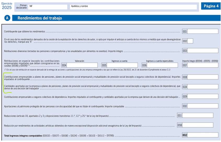Las contribuciones a favor del contribuyente realizadas por su empleador a planes de pensiones de empleo u otros sistemas de previsión social empresarial, además de reflejarse como reducción en el apartado comentado (casilla 427), se informan como ingreso en la casilla correspondiente del apartado Rendimientos de trabajo (casilla 8).