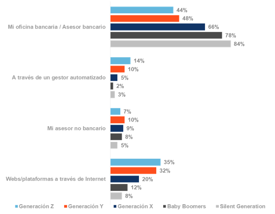 A la hora de contratar, la oficina bancaria (65%) sigue siendo el canal principal, aunque desciende siete puntos, mientras que la contratación vía web crece del 16% al 21% (32% y 35% entre los Centennials y Millennials, respectivamente).