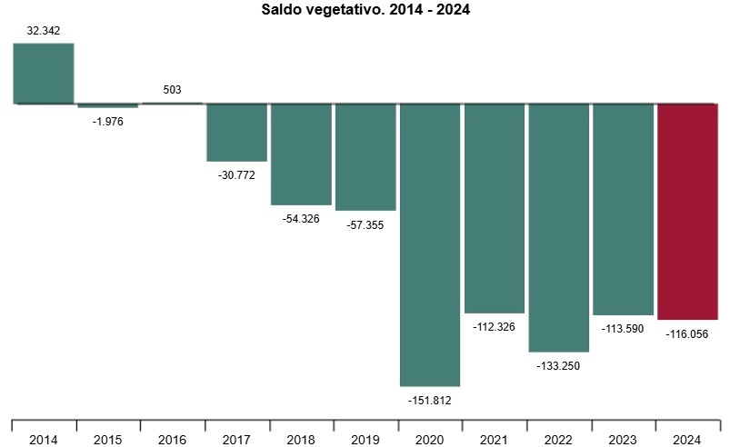 La diferencia entre nacimientos de madres residentes y defunciones de residentes en España en 2024 fue de -116.056 personas.