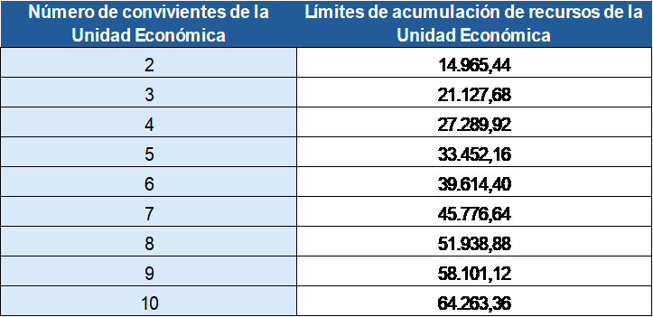 Los importes del límite de acumulación de recursos aplicable en función del número de personas que integran la unidad económica son los siguientes: