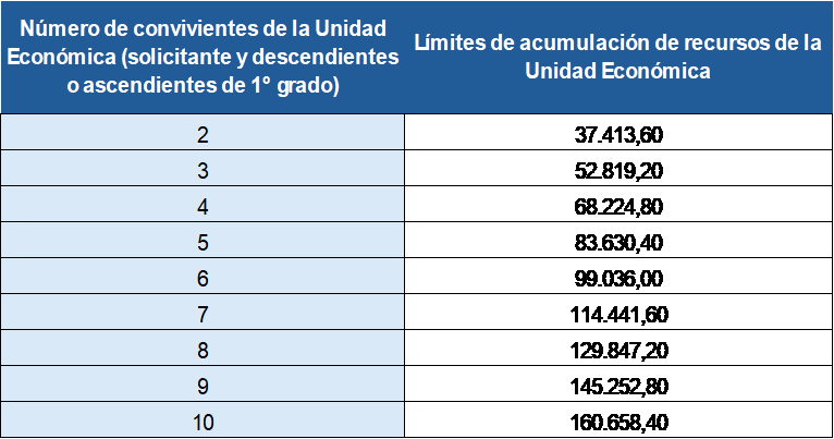 No obstante, si la convivencia se produce entre el solicitante y sus descendientes o ascendientes en primer grado (padre, madre, hijo/s), lo sean por consanguinidad o por adopción, el límite de acumulación de recursos aplicable en función del número de personas que integran la unidad económica se incrementa en 2,5 veces, siendo los importes los siguientes: