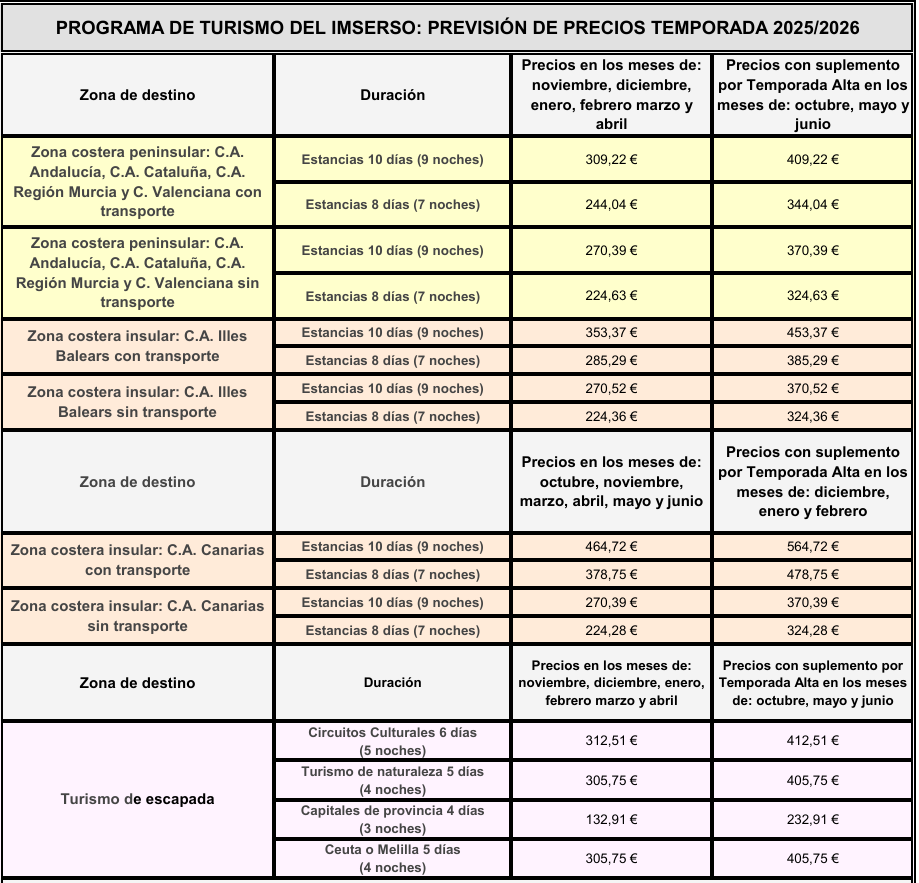Destinos y plazas del Programa de Turismo para la temporada 2025-2026