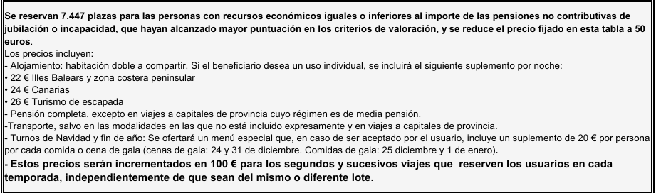 Por tanto, se reservan 7.447 plazas para las personas con recursos económicos iguales o inferiores al importe de las pensiones no contributivas de jubilación o incapacidad, que hayan alcanzado mayor puntuación en los criterios de valoración, y se reduce a 50 euros el precio fijado en la tabla de precios (que veremos más abajo).
