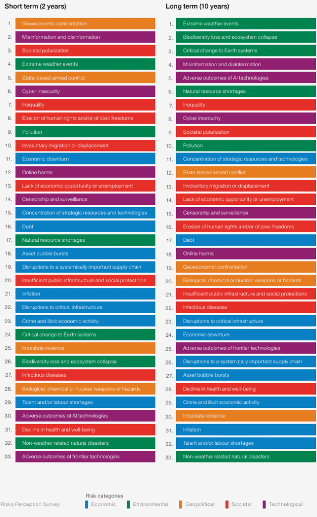 El cambio crítico en los sistemas terrestres y la pérdida de biodiversidad y el colapso de los ecosistemas también cayeron y están en la mitad inferior de la lista de riesgos este año en la perspectiva a dos años.