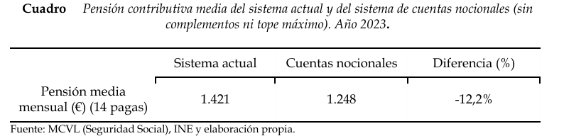 En un escenario optimista (con un crecimiento futuro del PIB del 2,2%) y desde un punto de vista colectivo (incorporando las cotizaciones de los que no llegan a jubilarse por fallecimiento, incapacidad o por no cumplir el periodo de carencia), la pensión del sistema de cuentas nocionales sería un 12,2% inferior a la pensión contributiva del sistema actual.